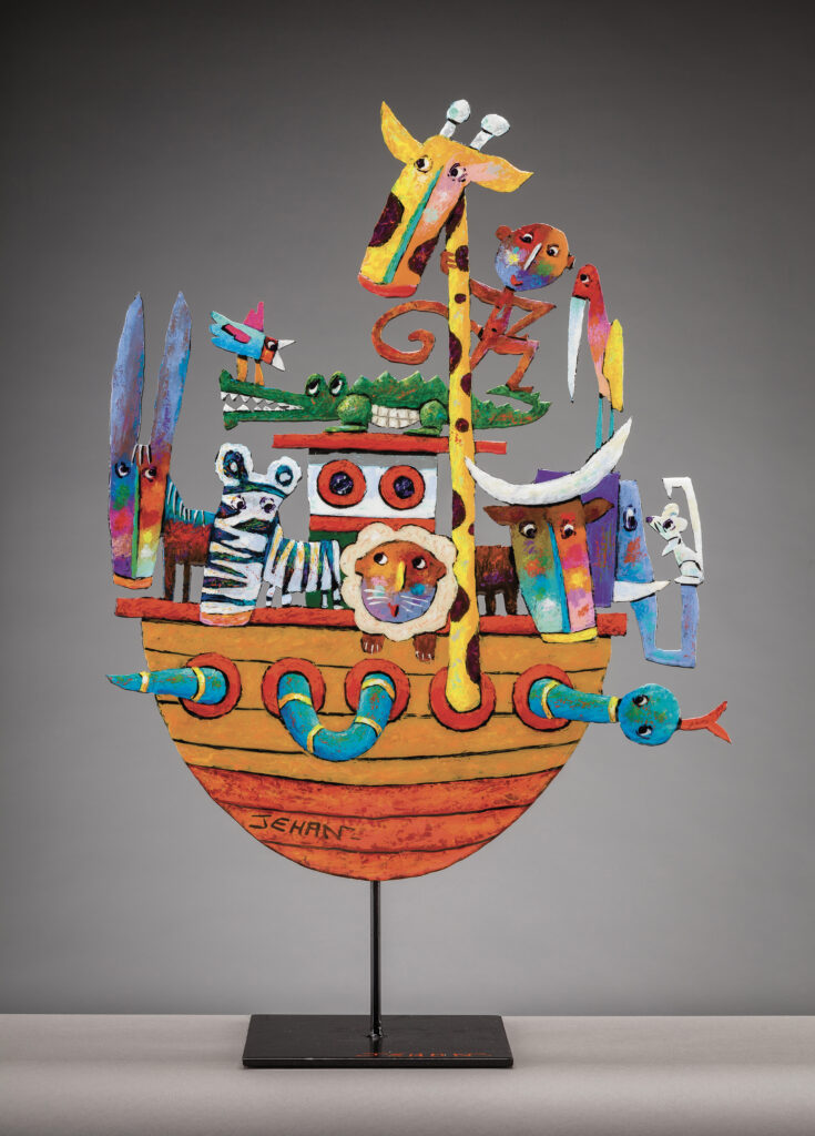 À la fois peintre et sculpteur, l’artiste offre un univers fait d’humour et de malice. Ses oeuvres faussement enfantines s’animent de personnages